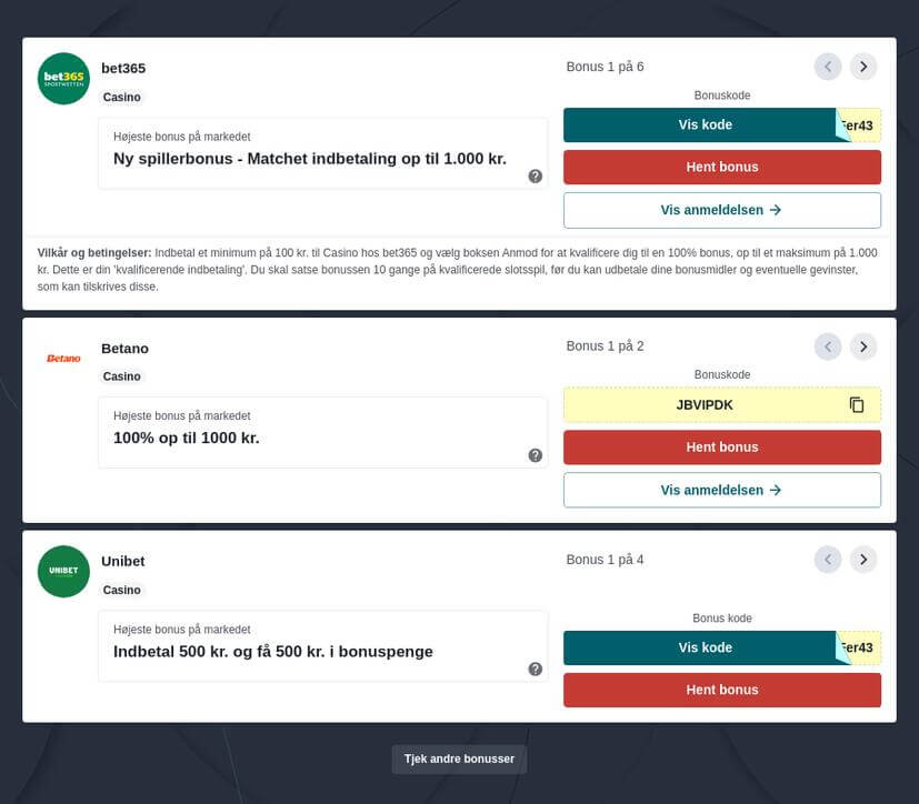 Hos bet365 varierer omsætningskravene afhængigt af den specifikke bonus. Typisk ligger det på 10x (d+b). Det betyder, at hvis du modtager en bonus på 100 kr. med et omsætningskrav på 10x, skal du spille for 1.000 kr, før du kan trække gevinsterne hjem. Bet365 er kendt for sine detaljerede og klare vilkår, hvilket gør det lettere for spillere at forstå, hvad der kræves for at opfylde omsætningskravet. Det er også værd at bemærke, at bet365 ofte tilbyder kampagner og bonusser, som kan have lavere omsætningskrav, hvilket gør det mere attraktivt for spillere.