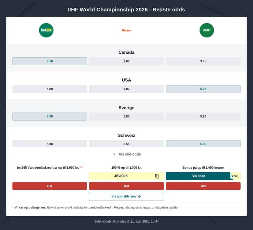 Lige nu handler væddemål på VM i ishockey 2026 mest om vinderodds, hvor Canada topper hos bet365 med 3,25. Det giver en tidlig fornemmelse af styrkeforholdet, men den fulde menu kommer først senere, når bookmakerne åbner for flere markeder og levende spil frem mod turneringsstart.