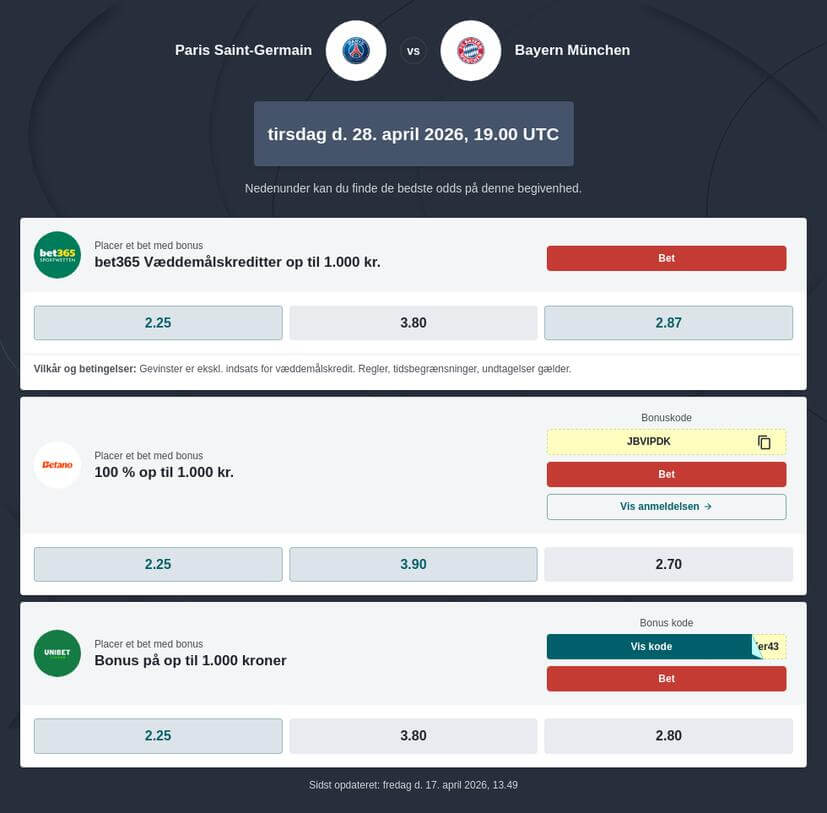 Odds udbydes blandt andet af bet365, Unibet og Betano, hvor PSG vs Bayern odds og spilforslag kan sammenlignes pÄ tvÊrs af markederne.